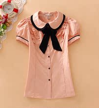 夏少女韩版蝴蝶领结娃娃领白色短袖衬衫小熊维尼学院风中学生衬衣