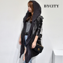 2016秋冬韩版带帽真皮皮衣 时尚百搭宽松中长款山羊皮风衣女外套