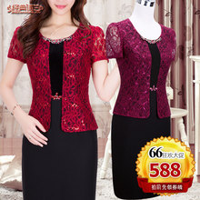 新款夏装假两件短袖蕾丝婚礼妈妈装夏修身显瘦连衣裙中年大码裙子
