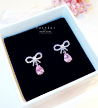 韩国日韩版时尚气质粉水晶蝴蝶结s925纯银针防过敏耳钉耳环耳饰女