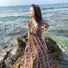 2017春夏装新款潮韩版显瘦V领碎花雪纺连衣裙女喇叭袖沙滩长裙子