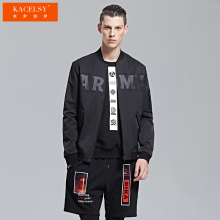 Kacelsy男士夹克短款潮牌字母外套 几何罗纹立领宽松青年男装上衣