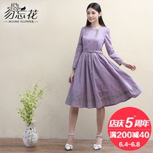 勿忘花2017春装新款女装文艺复古棉麻收腰七分袖连衣裙春季旗袍裙