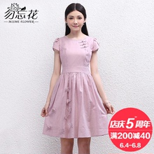 勿忘花2017夏装新款女装 文艺复古盘扣棉麻连衣裙短袖高腰A字裙