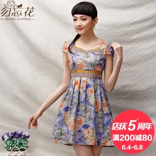 勿忘花2016夏装新款品牌女装复古印花方领棉布印花短袖连衣裙夏季