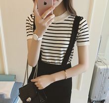 2017新款韩版休闲百搭短袖纯棉修身大码黑白细横条纹T恤女体恤夏