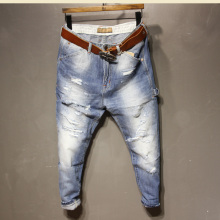 2016春夏新款破洞补丁欧美微弹力牛仔裤男修身小脚做旧小脚裤男潮