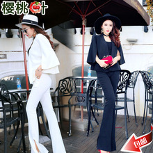 欧美大牌斗篷外套+高腰显高长裤喇叭裤秋款套装女装时尚潮两件套