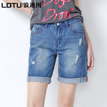 浪迪图2017夏装牛仔短裤女宽松显瘦大码BF卷边破洞牛仔热裤直筒裤