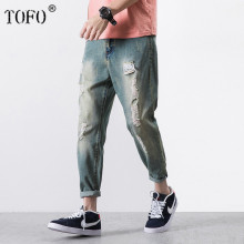 春夏季新款牛仔裤男破洞乞丐裤补丁做旧时尚潮牌哈伦男士九分裤子