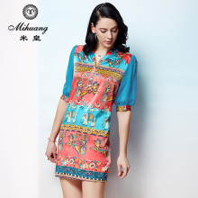 米皇正品夏新款中袖真丝连衣裙复古文艺桑蚕丝V领印花女裙267582