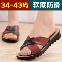 夏天真皮中年女凉拖鞋大码41平底妈妈皮拖鞋软底防滑中老年人鞋43