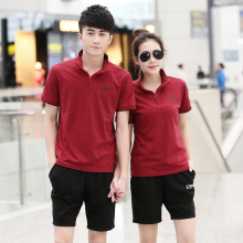 2017夏季情侣运动套装翻领T恤短袖短裤休闲套装透气速干男女跑步