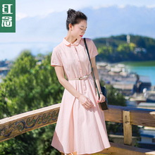 红念夏装新款收腰白色连衣裙粉色衬衫女中长款衬衫裙文艺短袖衬衣