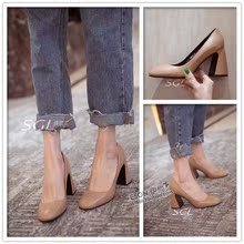 欧货欧洲站真皮女鞋2017春新品粗跟圆头胎牛皮时尚高跟鞋浅口单鞋