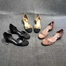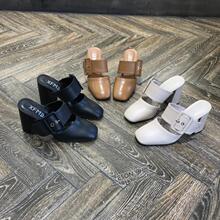 2017夏新品欧货欧洲站真皮女鞋粗跟方头搭扣时尚高跟鞋凉拖鞋单鞋