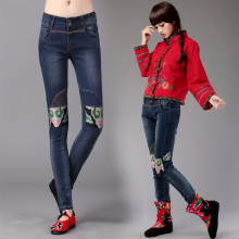 萝素唱游2017民族风女装裤子修身显瘦长裤小脚铅笔裤刺绣牛仔裤