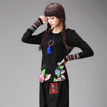 行露2017新款春秋民族风女装t恤上衣刺绣棉麻修身长袖圆领打底衫
