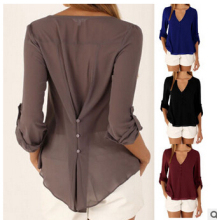 Ebay速卖通爆款2016欧美女款长袖V领宽松大码雪纺衫