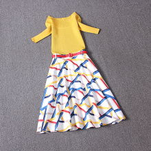 欧洲站2017春夏新款女装一字领短袖针织衫+中长款半身裙伞裙套装