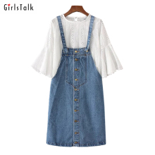 小清新学生套装连衣裙2017春夏新款白色镂空喇叭袖T恤+牛仔背带裙
