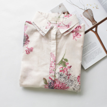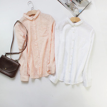 A47 淡雅清新双领薄棉中长款花色长袖衬衫藕粉色纯棉衬衫女款