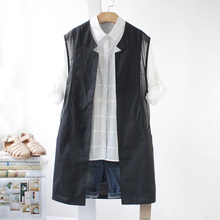 D42正品推荐 剪刀领网纱拼接亚麻面料中长款显瘦马夹无袖上衣新品