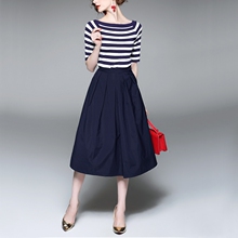 欧洲站夏装女2017新款蓝白条纹连衣裙拼接时尚撞色收腰中裙欧货潮