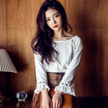 2017日系度假风深V领交叉绑带露肩雪纺衫 荷叶边吊带喇叭袖上衣潮