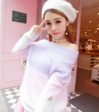 2017春季新款女装 甜美百搭一字领拼色露肩马海毛针织毛衣+花装饰