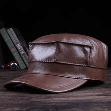 秋冬新品真皮帽子男士牛皮平顶帽中老年人保暖军帽护耳鸭舌帽棉帽