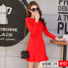 2017修身韩版显瘦打底裙气质小红裙时尚红色长袖连衣裙秋冬款女装