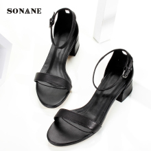 SONANE/索娜妮夏季新款女鞋露趾头层牛皮一字带扣粗中高跟女凉鞋