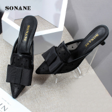 索娜妮2017新款尖头蝴蝶结包头鞋中跟网纱镂空拖鞋猫跟鞋女凉拖鞋