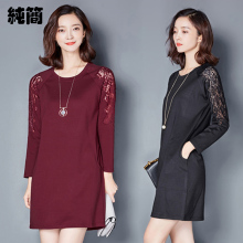 纯简2017春装新款长袖T恤女中长款网纱打底衫圆领蕾丝拼接连衣裙