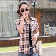 2017夏装新款 韩版修身格仔衬衫女短袖 休闲衬衣