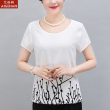 2017中老年女装夏季加大码棉麻T恤40-60岁妈妈装宽松印花短袖上衣