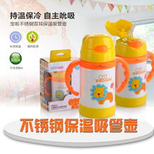 宝啦 不锈钢带手柄婴儿保温水壶水杯 宝宝吸管杯 儿童吸管保温杯