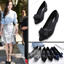 2017春款韩版女单鞋春季新款粗跟中跟浅口尖头蝴蝶结大码工作女鞋