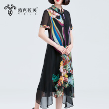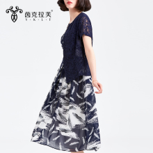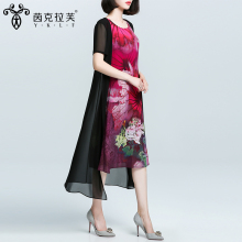 2017夏装新款时尚印花长裙气质圆领假两件妈妈装大码雪纺连衣裙