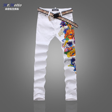 春秋新款薄男装韩版潮修身直筒彩绘男士牛仔裤欧美印花男白色裤子