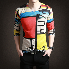 新款男装T恤男士长袖t恤春秋款V领彩色印花半袖体恤潮打底衫男