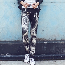 春秋新款修身直筒韩版潮牛仔裤彩绘印花男士花裤子男装舞台歌手