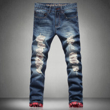 潮牌春季新款男装 补丁贴布乞丐 破洞牛仔裤男 修身直筒长裤韩版