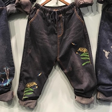 新牛仔七分裤印花女孩图案破洞牛仔裤哈伦宽松大码松紧腰女裤马裤