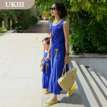 亲子装夏装2017韩版母女莫代尔连衣裙蓝色显瘦亲子度假裙女童长裙