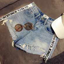 LEA 夏装韩版新款破洞毛边蓝色牛仔短裤超人字母修身显瘦超短裤潮