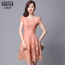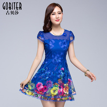 古贝莎高端品牌女装2017夏装新款a字刺绣蕾丝印花网纱气质连衣裙