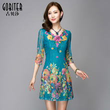 古贝莎2017夏季新品中长款显瘦气质印花裙改良旗袍礼服雪纺连衣裙
