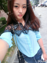 秒杀!小辣椒4月19日透视拼接蕾丝拼皮水蓝色衬衫